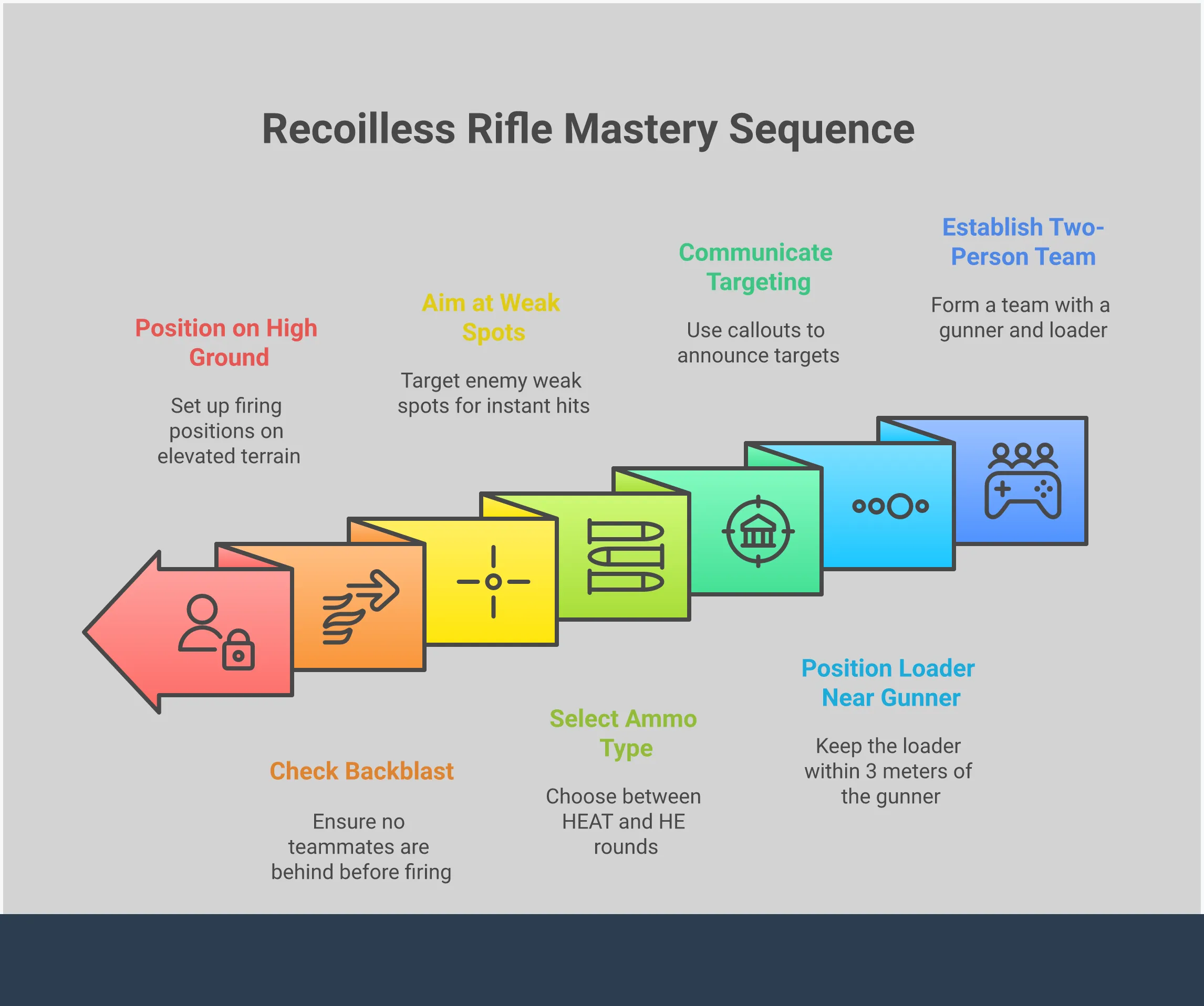 Главный недостаток безоткатного ружья — медленная перезарядка, но с ней можно справиться, используя некоторую тактику. Перезарядка сама по себе оставляет вас уязвимым, поэтому постарайтесь найти безопасный момент или попросите товарища по команде прикрыть вас. Лучший способ использовать ружье — попросить товарища по команде нести дополнительные боеприпасы — он сможет перезарядить его для вас практически мгновенно после каждого выстрела, позволяя вам стрелять на ходу. Также всегда выбирайте подходящий тип боеприпасов перед стрельбой: используйте кумулятивные снаряды против техники и брони, а осколочно-фугасные — для быстрого уничтожения групп слабых врагов.