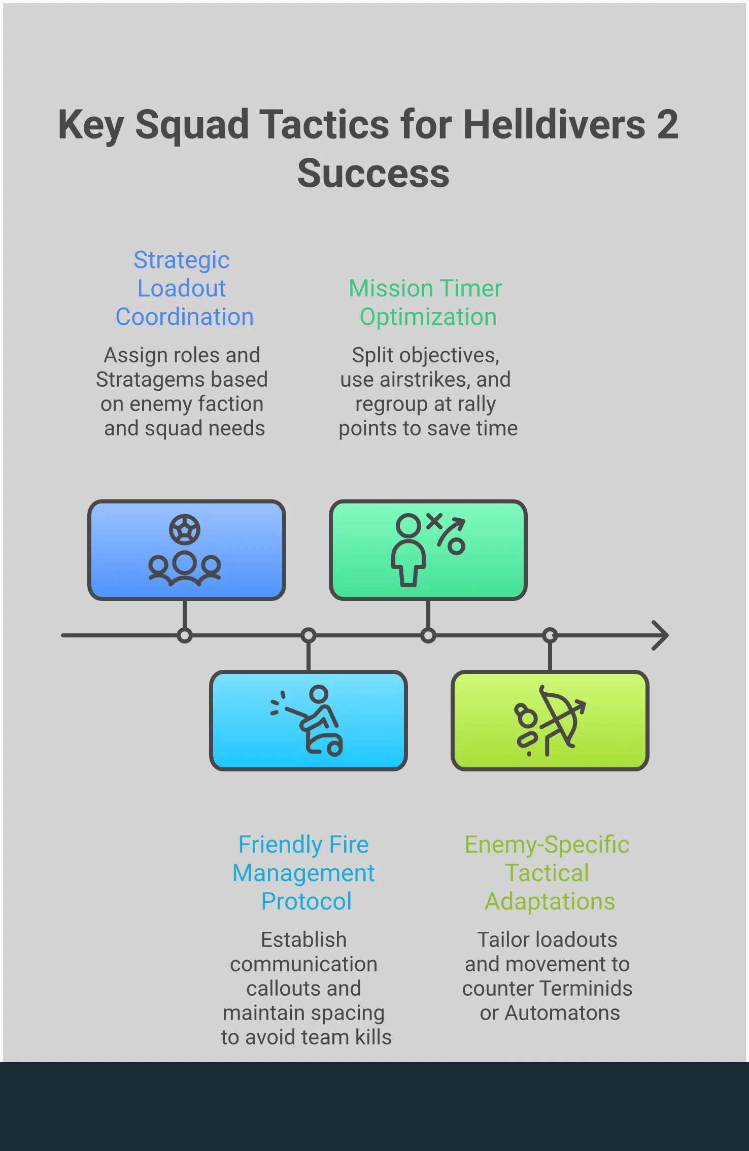 Даже команда, которая выглядит отлично на бумаге, может потерпеть неудачу, если не сможет адаптироваться к меняющимся ситуациям. Перед каждой миссией важно учитывать планету, врагов, с которыми вы столкнетесь, и то, что вам нужно выполнить. Борьба с роботами требует другой стратегии, чем борьба с жуками. Аналогично, динамичные миссии требуют быстрого, мобильного подхода, в то время как защита местоположения допускает более осторожную стратегию. Каждая миссия в Helldivers 2 имеет ограничение по времени, заставляя вас быстро выполнять цели. Это означает, что вам нужно быть гибким и готовым изменить свои планы, если что-то пойдет не так, как ожидалось. Четкая коммуникация с вашей командой — это самое важное, что вы можете сделать.
