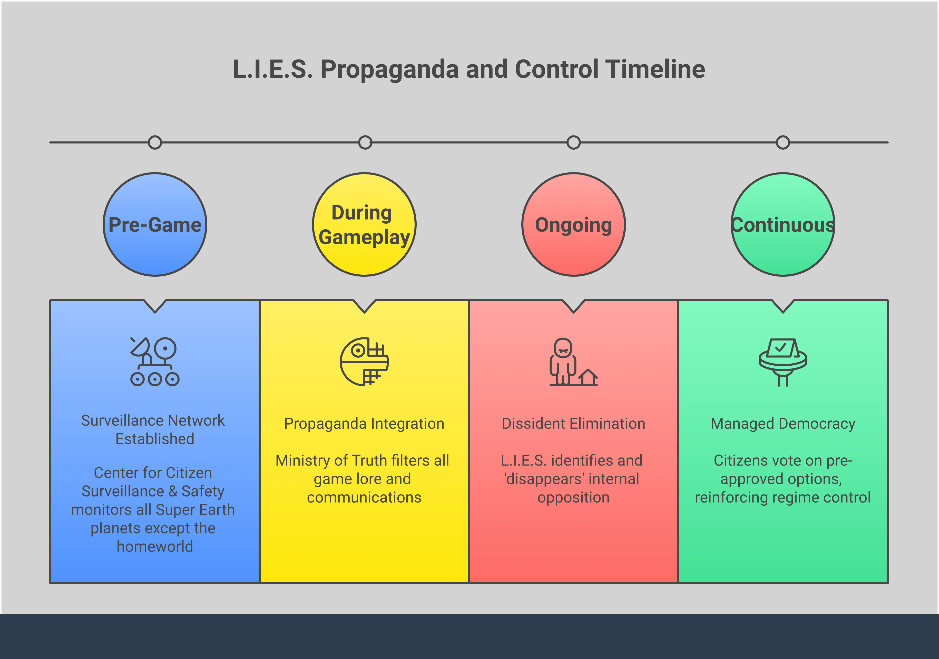 Как тайная группа контролирует целую галактику? Дело не только в военной мощи. L.I.E.S. поддерживает власть над Super Earth посредством тщательного контроля информации. Они эксперты в манипулировании тем, что люди видят, слышат и во что верят, чтобы поддержать свои цели. Этот контроль опирается на три основные вещи: постоянное наблюдение, подавление инакомыслия и доминирование во всех медиа с помощью собственной нарративной. Это тревожно эффективный метод, который заставляет граждан неосознанно помогать в собственном угнетении. Контролируя всю информацию – от новостей до военных отчетов – L.I.E.S. гарантирует, что их версия событий – единственная, которую знают люди. Этот тотальный контроль над историей делает их настолько могущественными во вселенной Helldivers.