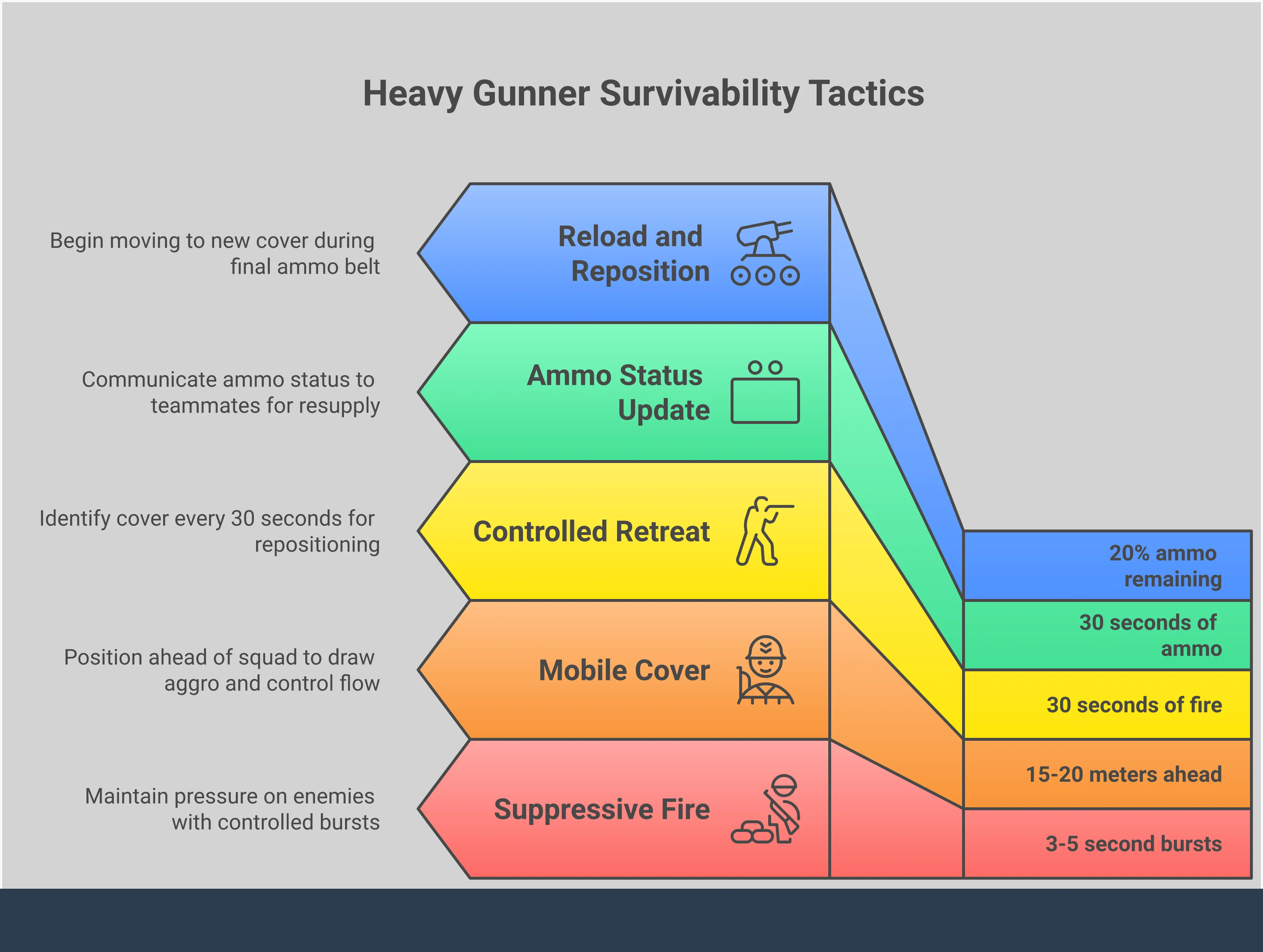 Это улучшение посвящено совместной работе в команде. Повышение живучести пользователя пулемёта означает, что он может надёжно удерживать позицию и поддерживать отряд. Снижение урона побуждает игроков оставаться со своими товарищами по команде и защищать их. Они могут привлекать на себя вражеский огонь, например, от мощных атакующих, зная, что смогут выдержать некоторый урон, пока товарищи по команде сосредоточатся на устранении угроз. Это превращает пользователя пулемёта в мобильный щит, надёжную опору для команды. Это способствует более скоординированному стилю игры, в котором основное внимание уделяется созданию безопасных зон и возможностей для всех остальных, делая их ценным активом для любой команды.