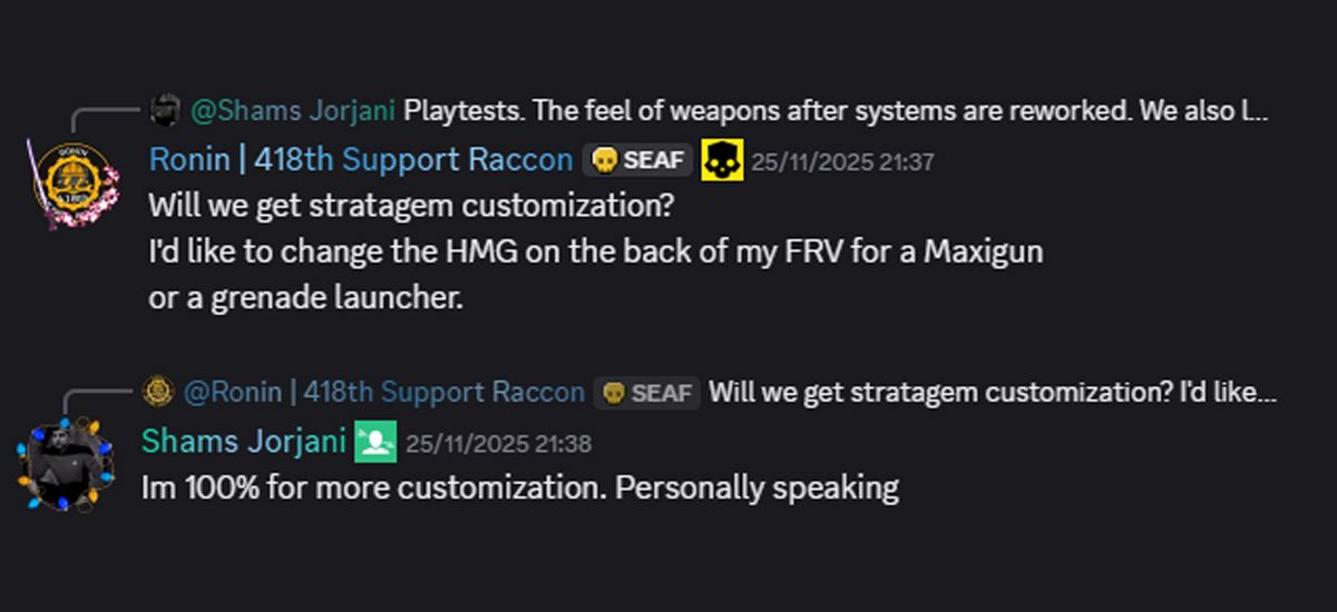 Игрок спросил на официальном Helldivers 2 Discord-сервере, смогут ли Стратагемы быть настроены в будущем, предложив заменить HMG на их FRV на Максиган или гранатомет. Йохан Пильстедт, генеральный директор игры, ответил, что лично поддерживает больше возможностей настройки. Хотя это не гарантирует, что настраиваемые Стратагемы будут добавлены в ближайшее время, позитивно то, что разработчики рассматривают эту идею. Пильстедт уточнил, что его поддержка является личным мнением и может не отражать взгляды всей команды разработчиков.