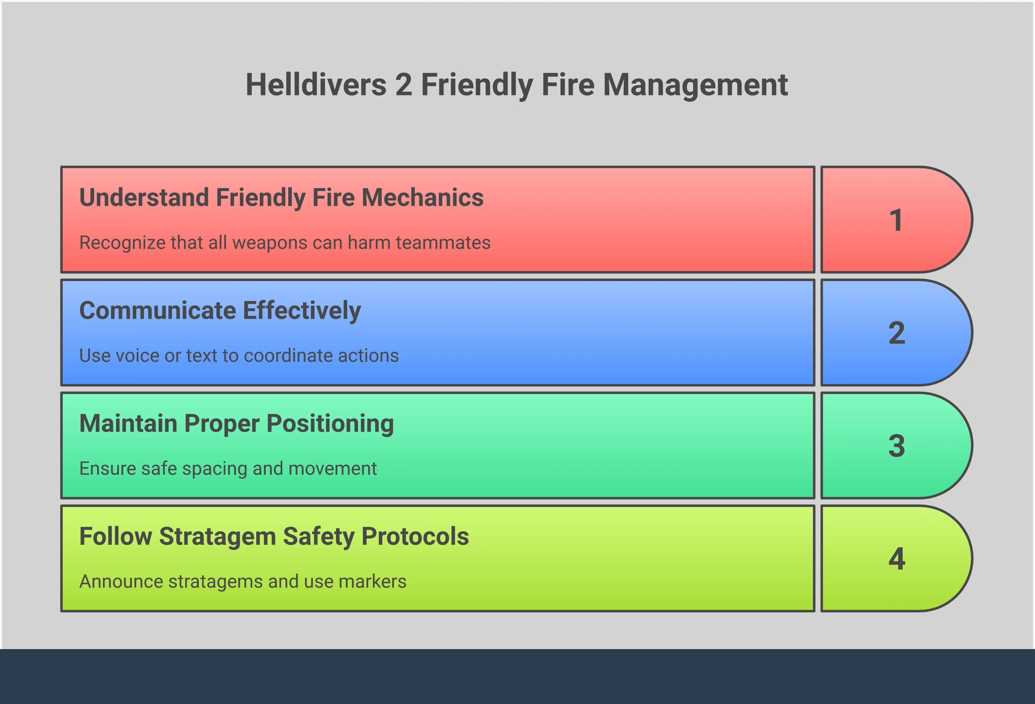 Даже когда товарищи по команде случайно попадают друг в друга в Helldivers 2, это шанс научиться. Не игнорируйте случаи дружественного огня — уделите немного времени, чтобы понять, что пошло не так. Это был плохо прицеленный выстрел, или кто-то побежал в опасность, не обращая внимания? Эти ошибки — не просто повод для смеха; они помогают вам стать лучшим, более внимательным игроком. Понимая, что произошло, ваша команда может скорректировать свою стратегию для следующего боя. Рассматривая каждую случайную смерть как урок, можно уменьшить разочарование и мотивировать всех улучшать свои навыки, как индивидуально, так и командой.
