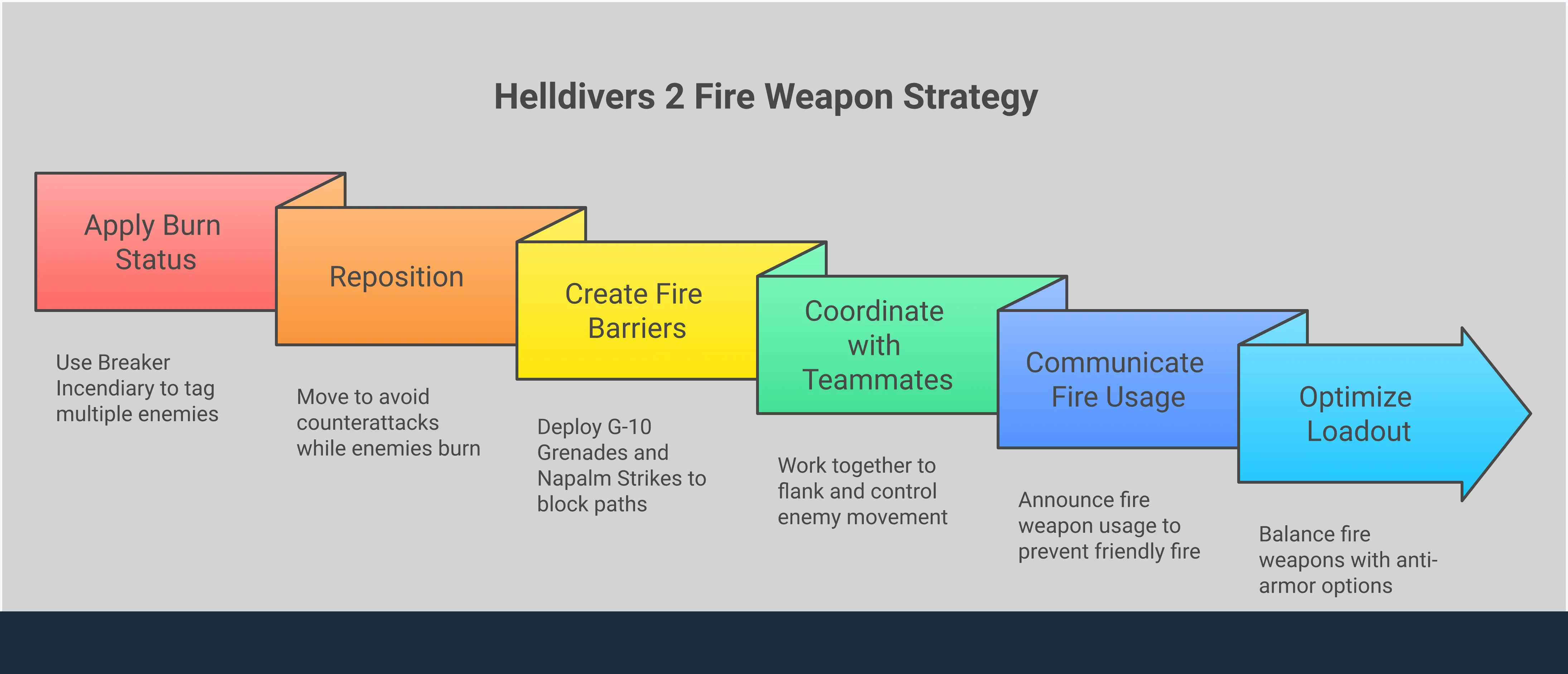 В целом, лучше иметь в арсенале разнообразные типы оружия, чем сосредотачиваться исключительно на уроне огнём. Хотя огонь отлично подходит для контроля групп врагов, он не будет очень эффективен против тяжелобронированных противников, таких как Гнойный Титан, если у вас нет оружия, специально предназначенного для борьбы с броней. Используйте оружие, основанное на огне, такое как Поджигающий Разрушитель или Огнемет, для контроля толпы, но также берите с собой оружие, такое как Рельсотрон или Безоткатное орудие, чтобы справиться со всеми видами угроз, с которыми вы можете столкнуться во время миссии.