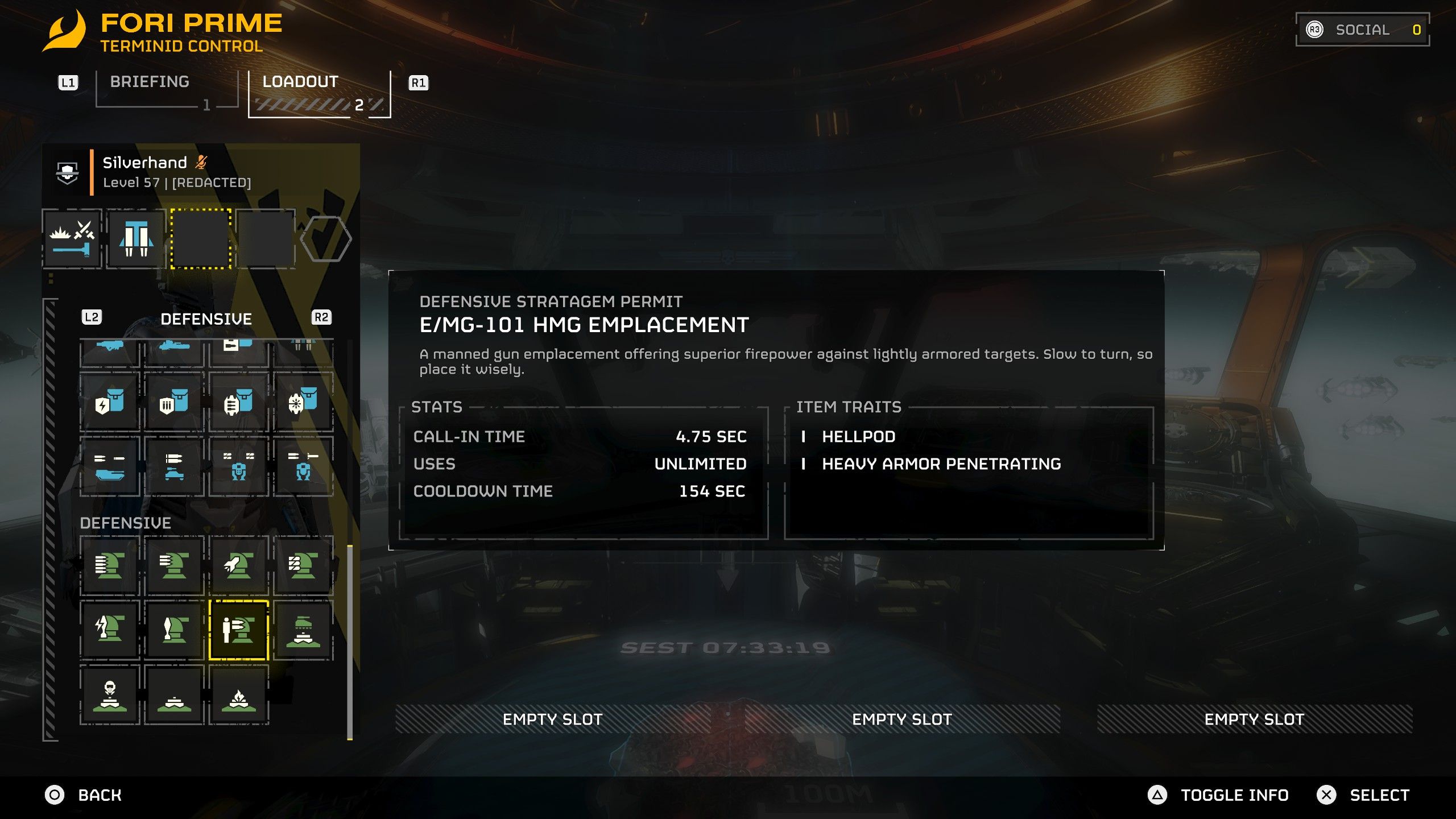После разблокировки вы можете найти E/MG-101 HMG Emplacement в вашем Снаряжении в разделе Оборонительных Стратагем. Чтобы развернуть его, используйте код стратагемы: Вниз, Вверх, Влево, Вправо, Вправо, Влево. Вы можете использовать HMG Emplacement столько раз, сколько необходимо, но на его вызов требуется 4,75 секунды, и вам придется подождать 154 секунды, прежде чем вы сможете вызвать его снова.