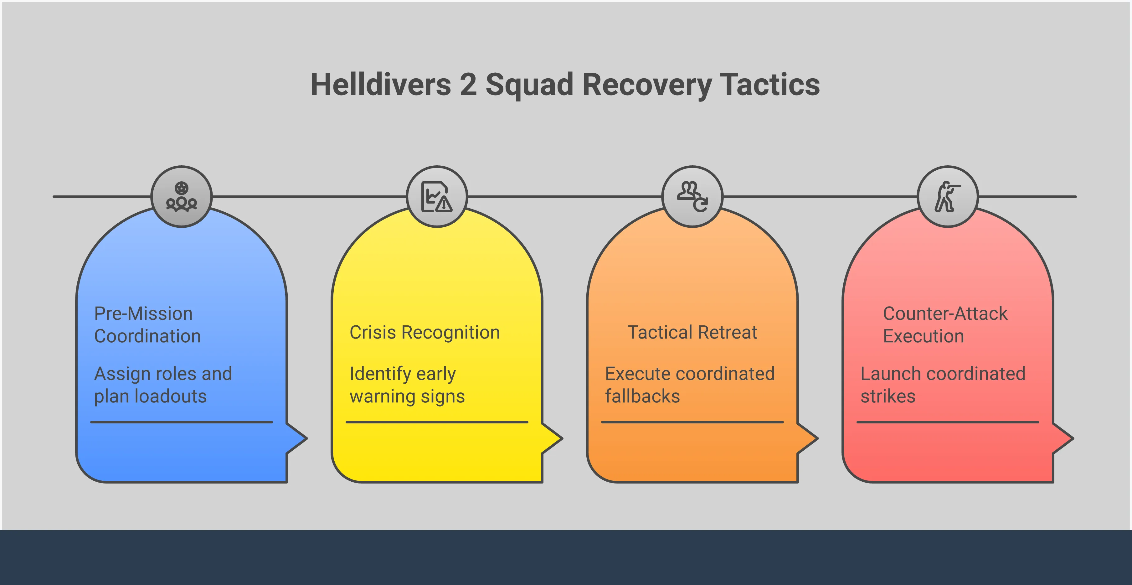 Если бой начинает складываться неудачно, худшее, что может сделать ваша команда, – это разделиться. Одинокий Helldiver не имеет больших шансов. Вместо того, чтобы разбегаться в разные стороны, быстро соберитесь вместе в заранее спланированном месте встречи. Это может быть за скалами, на недавно захваченном объекте или в любом месте, которое обеспечивает укрытие. Чётко объявите местоположение по связи – например, «Отступаем к большой скале!» – чтобы избежать хаоса и заставить всех двигаться как команда. Как только вы перегруппируетесь, вы сможете объединить свой огонь, вылечиться и подготовиться к повторному бою как единое целое.
