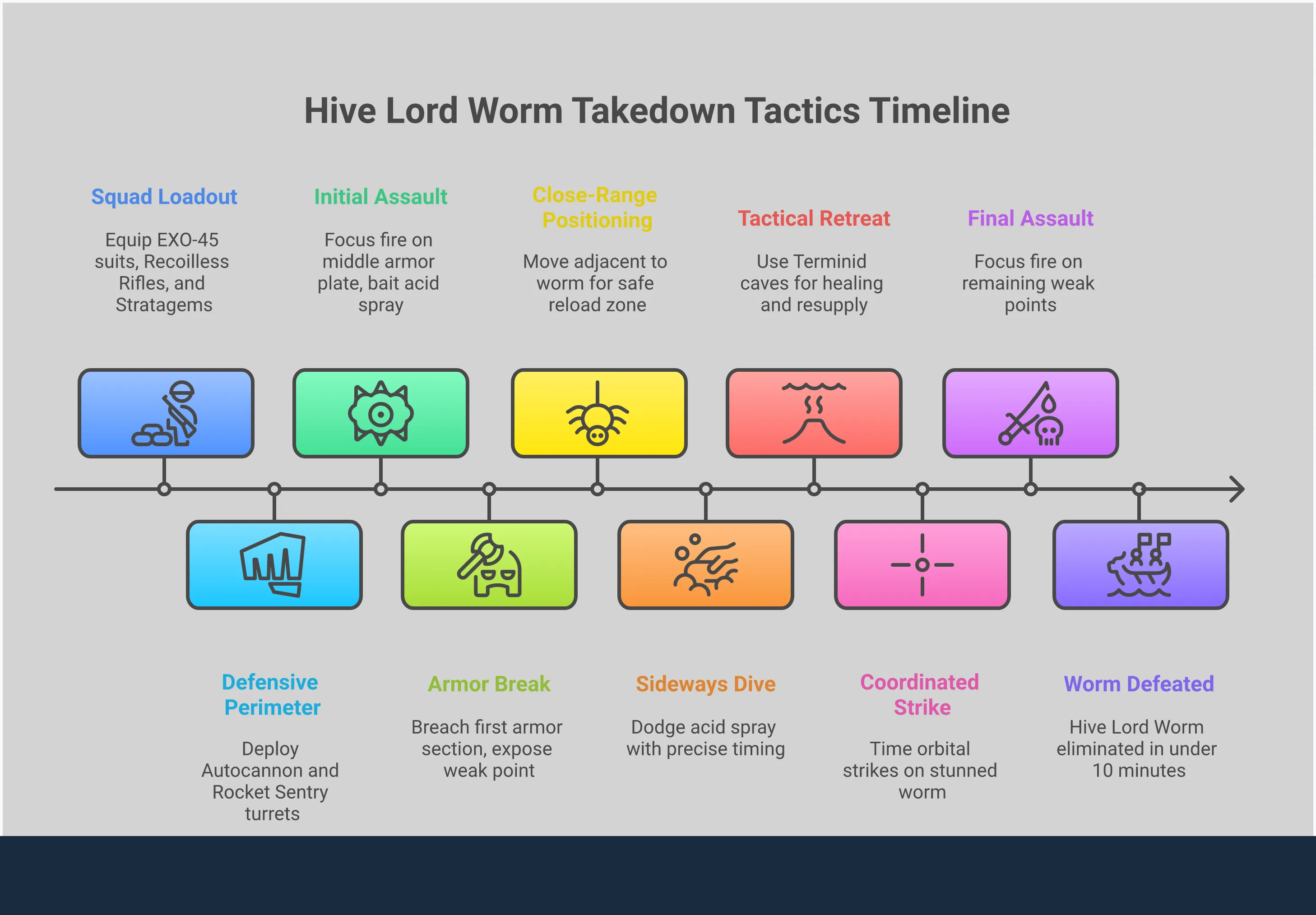 The Hive Lord Worm – не босс, которого можно победить, просто стреляя наугад. У него много здоровья и требуется, чтобы вся ваша команда работала вместе. Если каждый попробует что-то другое, вы, вероятно, быстро потерпите неудачу и вам придется начинать бой заново. Чтобы победить его эффективно, вашей команде нужно двигаться и атаковать как одно целое, сосредотачивая весь свой огонь на одном и том же слабом месте. Постоянная коммуникация и разумное использование специальных способностей – это ключ к успеху. Когда ваша команда действительно скоординирована, здоровье Worm будет быстро падать.