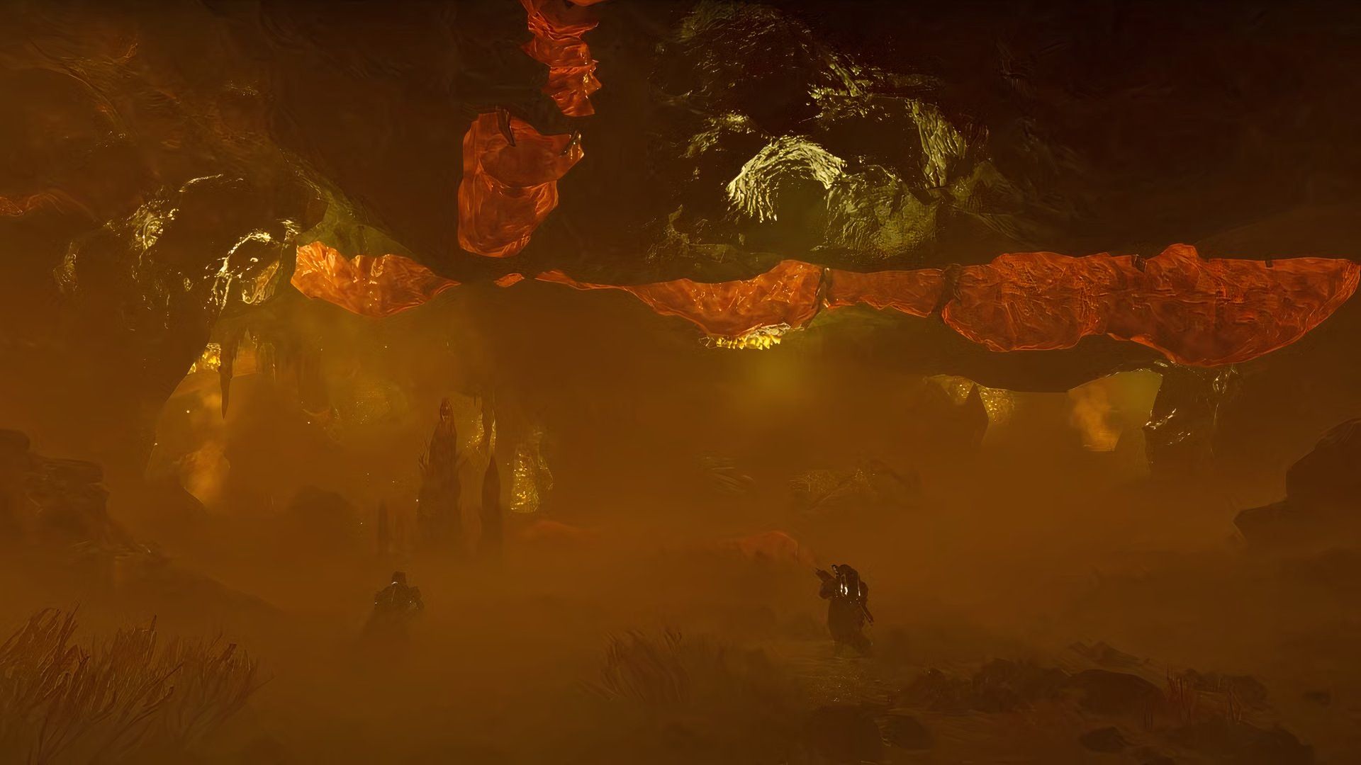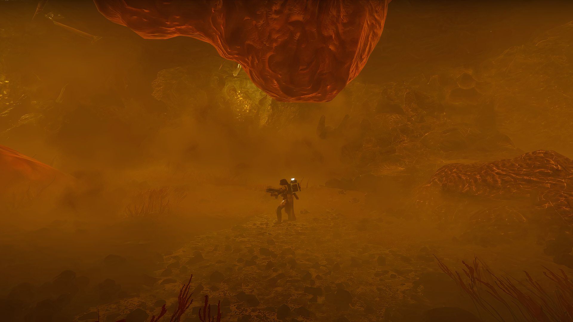 Прежде чем отправиться в пещеры, убедитесь, что у вас есть все необходимые боеприпасы и снаряжение для путешествия (подробности о выборе экипировки будут предоставлены позже). Когда вы и ваша команда будете готовы, отправляйтесь в пещеры. Будьте внимательны к сильному сопротивлению впереди, углубляясь в туннели Терминидов. Вы обнаружите различные «логова насекомых» на этих глубинах, включая возможные гнезда Билевых Титанов (особенно сложные без тактической поддержки с орбиты или «Орла»). Во время исследования уничтожайте «логова насекомых», но помните, что нужно следовать за мясистыми, оранжевыми кабелями на потолке (изображены на изображении ниже). Они подключены к Споровой Легочной системе и служат вашим проводником к источнику.