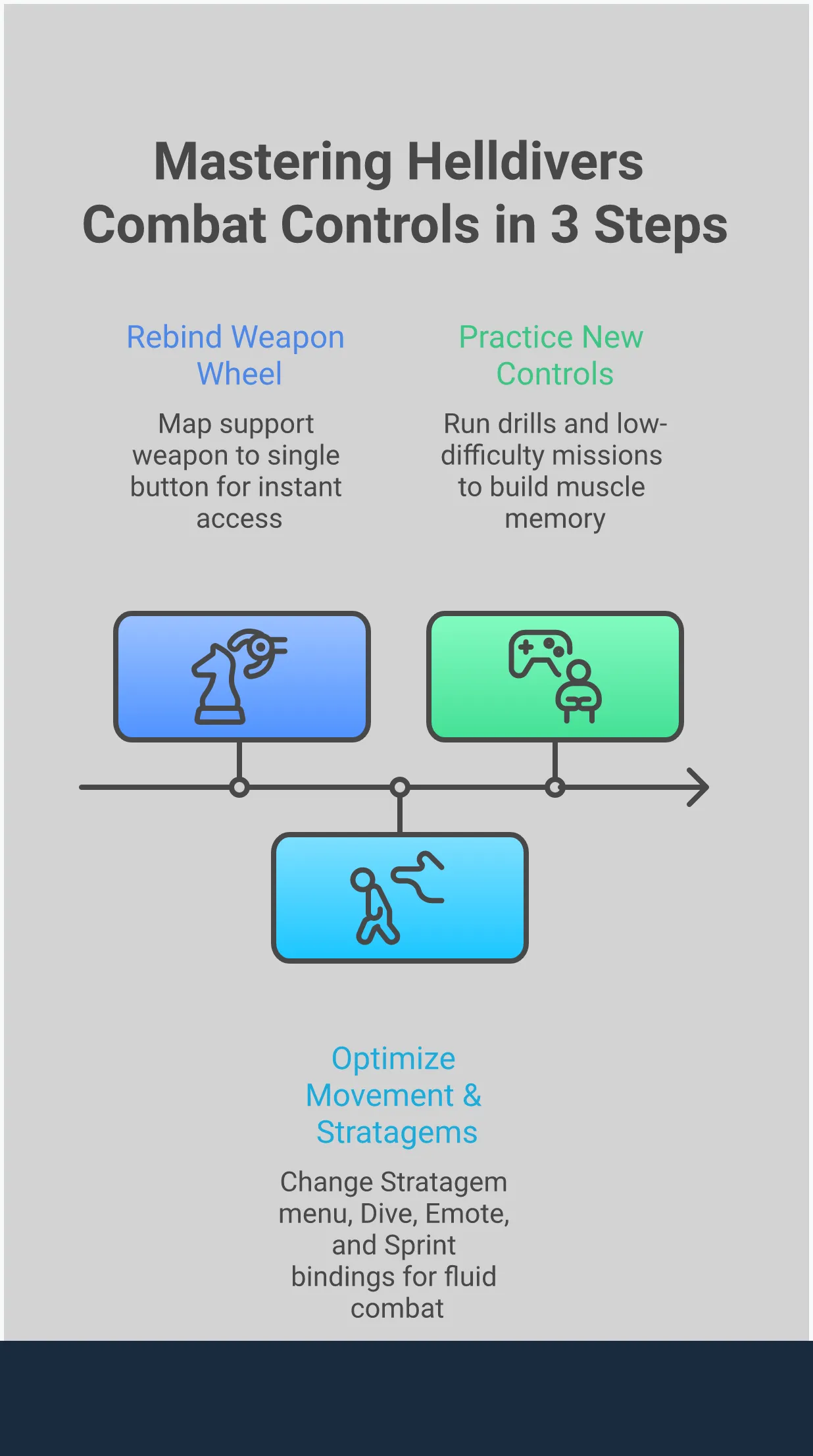 - Настройте управление для комфорта и плавности: Ваша схема управления должна ощущаться как продолжение ваших рук, а не как головоломка. Поэкспериментируйте с переназначением других неудобных действий, таких как Нырок, Спринт или доступ к Стратегемам, чтобы создать раскладку, которая ощущается естественно и предотвращает случайные нажатия.