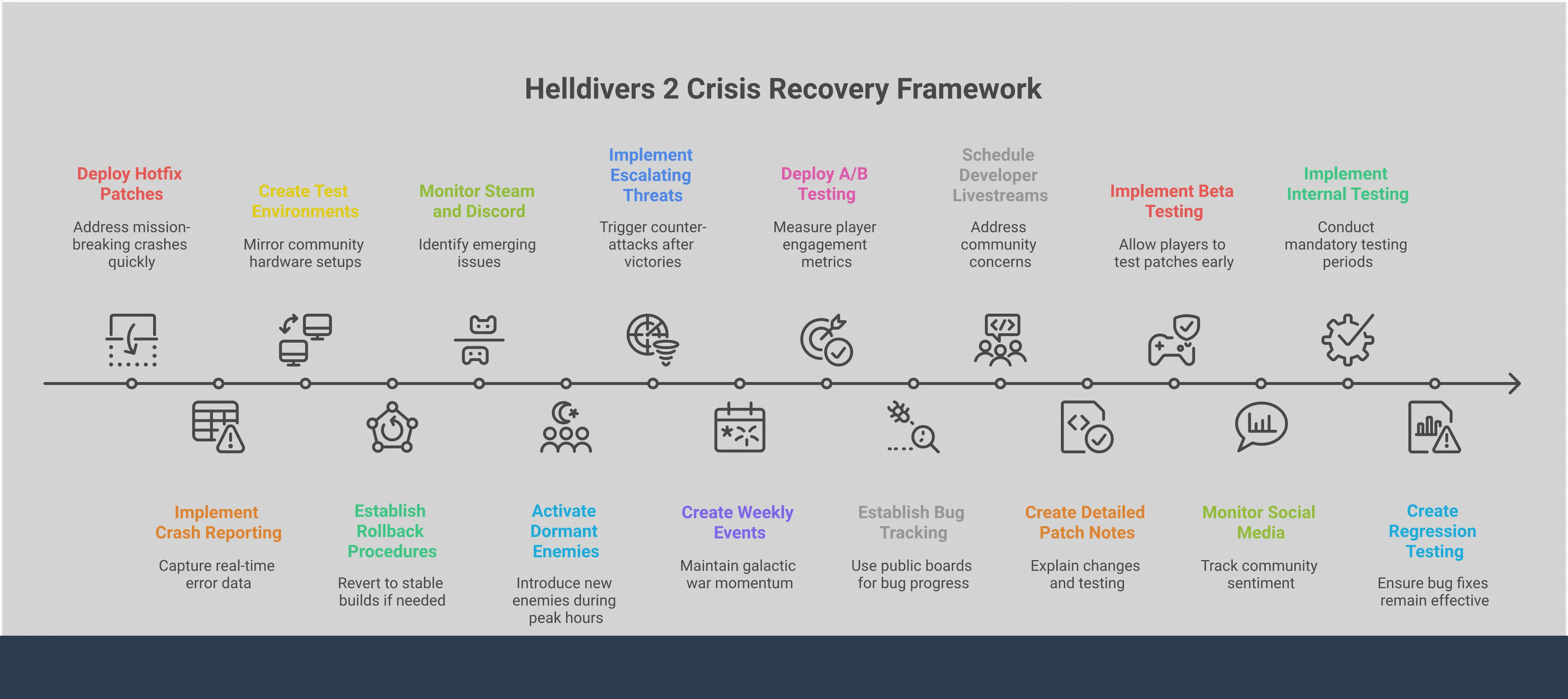 Чтобы улучшить игру, нам нужно сосредоточиться на основах. Прежде чем добавлять новый контент, такой как Warbonds или врагов, мы должны обеспечить надёжный и стабильный опыт для всех игроков. Это означает исправление ошибок, улучшение производительности и возвращение ощущения динамики галактической войне, продвигая сюжетную линию и выпуская долгожданный контент. Восстановление доверия игроков начинается с надёжной и плавно функционирующей игры.