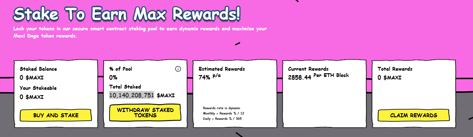 Но вот настоящий сюрприз: доходность. Награды за стейкинг достигают восхитительных 74% APY, выплачиваются в $MAXI, а распределением занимается стильный ежедневный пул смарт-контрактов. Если вы держали $DOGE или $SHIB просто ради атмосферы, что ж, Maxi Doge только что улучшил ваш опыт владения мем-коинами. 🎉