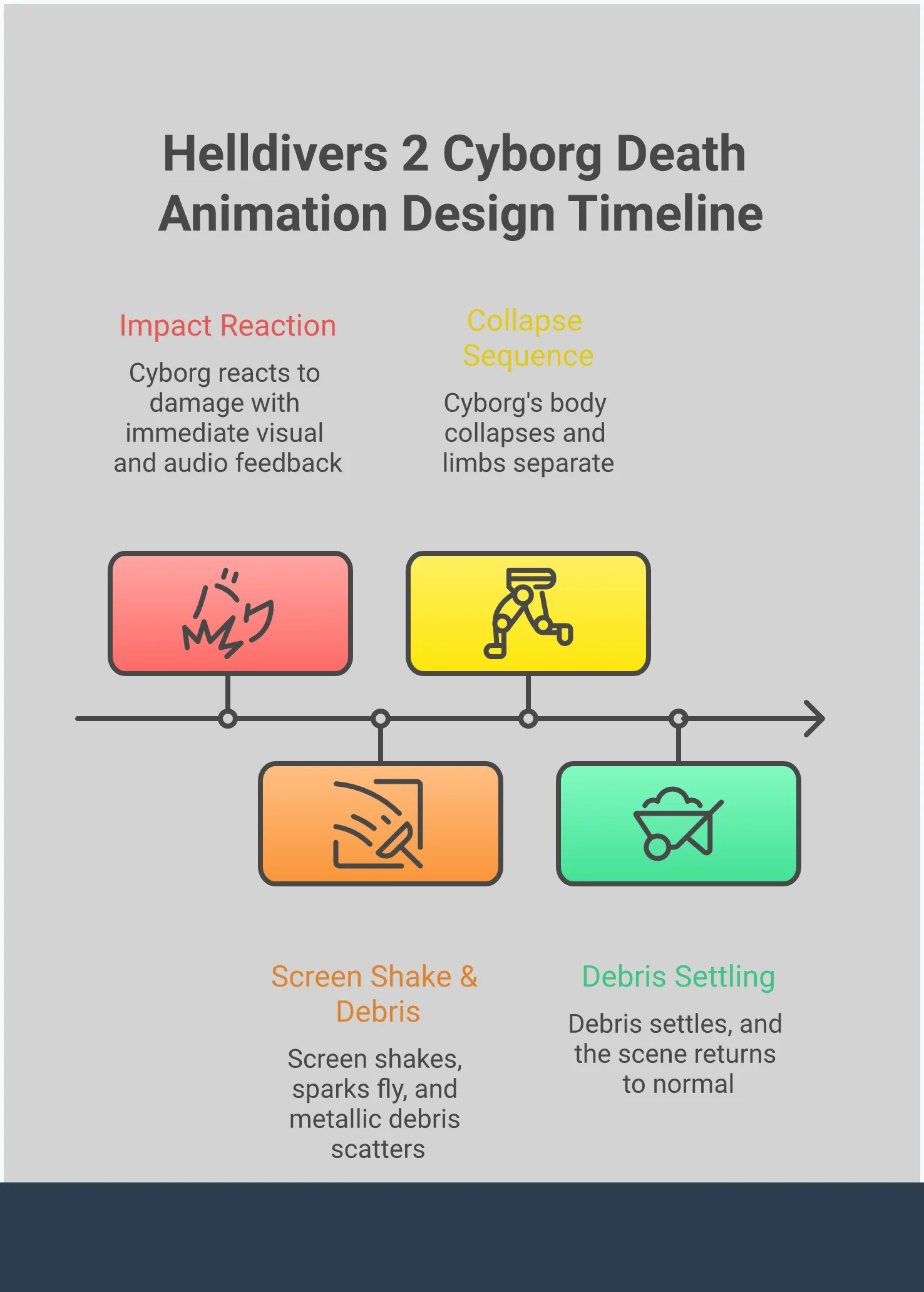 Анимирование персонажа, такого как Киборг из Helldivers, требует демонстрации как его роботизированной, так и органической сторон. Движется ли он с металлическими звуками и искрами, или он показывает след живого существа, которым когда-то был? Анимации кажутся неестественными, когда не соответствуют этим установленным характеристикам. Они могут быть слишком простыми, не иметь сильного эффекта или просто не соответствовать врагу, с которым мы сражаемся. Великолепные анимации дают нам ощущение воздействия, делая наши действия стоящими, в то время как плохие могут сломать нашу концентрацию и испортить впечатления.