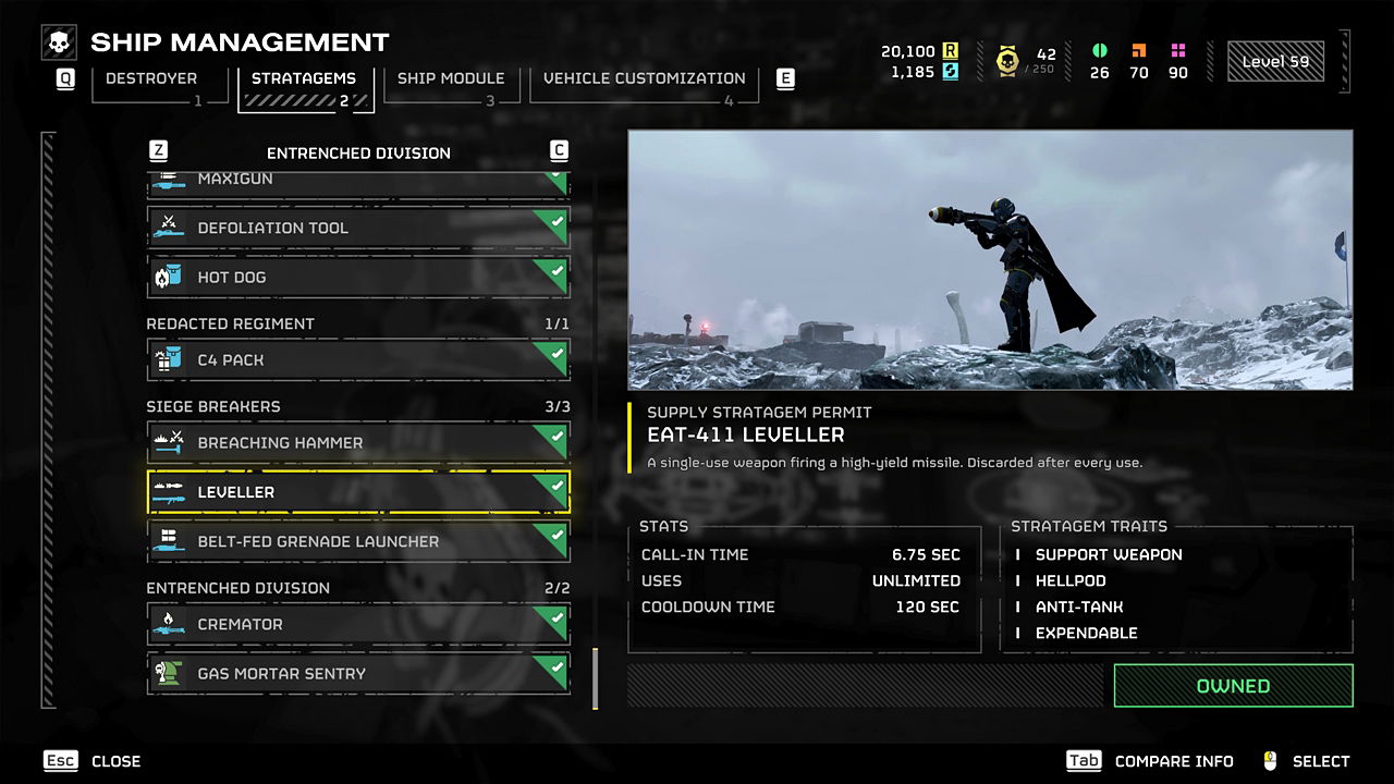 EAT-411 Leveller — это одноразовое, однозарядное противотанковое оружие. После выстрела его нельзя перезарядить, и для повторной зарядки требуется почти три минуты. Оно похоже на 500kg Bomb, но гораздо легче в переноске и позиционировании. Вы можете найти его на странице 2 Warbond Siege Breakers за 85 Medals.