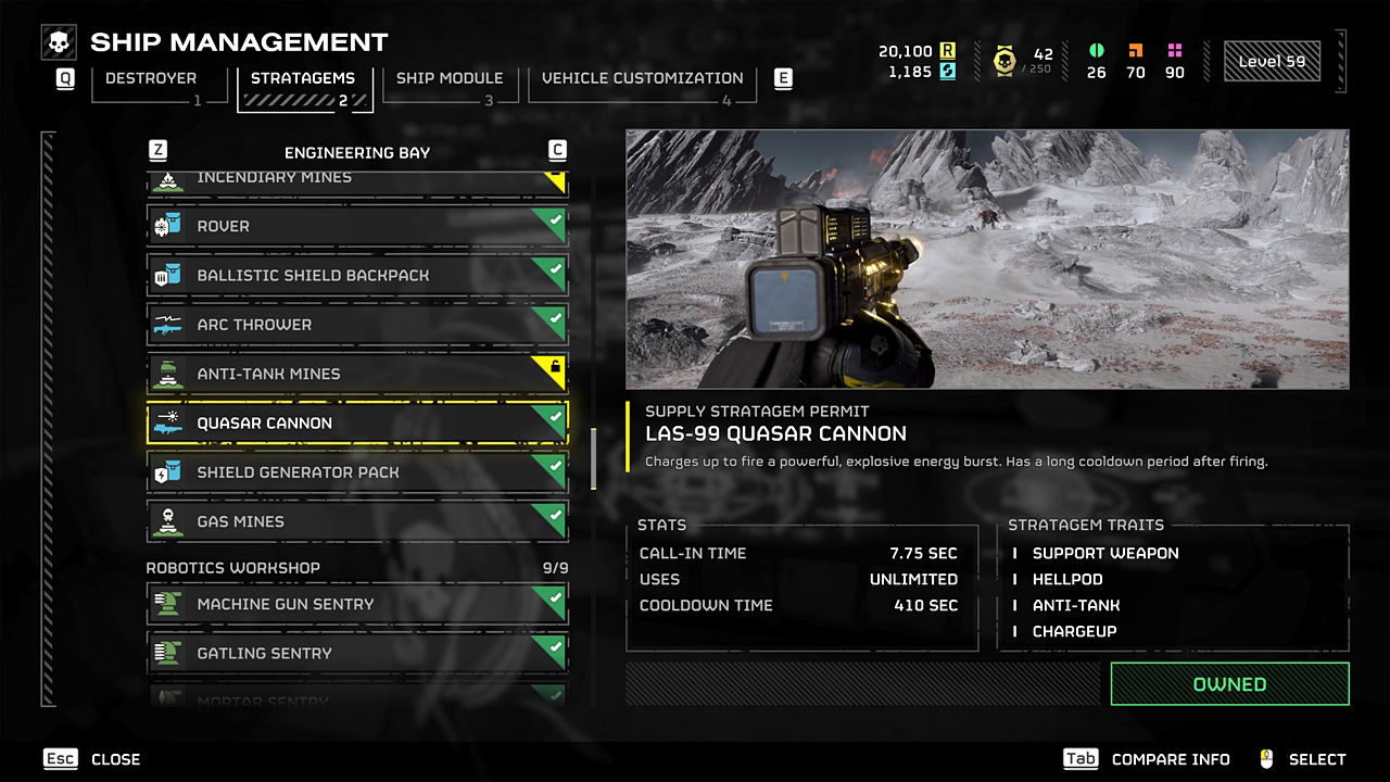 Окей, я только что разблокировал Пушку Квазар, и она довольно крутая. Это оружие поддержки, разработанное для уничтожения танков, и оно использует энергию, а это значит, что мне не нужно беспокоиться о нехватке боеприпасов – у неё практически неограниченный запас! Я получил её в Патриотическом Административном Центре, конкретно в секции Инженерного Отсека, и она стоила мне 7,500 Листов Запроса. Хотя, чтобы получить её, нужно быть как минимум 18-го уровня.