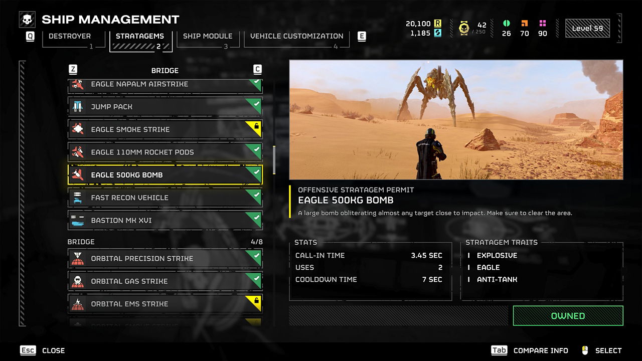 С момента своего выхода, бомба Eagle 500kg стала самой популярной и эффективной стратегической опцией в Helldivers 2. Хотя для освоения требуется практика, ничто не сравнится с волнением и успехом вовремя нанесенного удара. Вы можете открыть её на 15-м уровне за 10,000 Requisition Slips через ангар Патриотического Административного Центра.