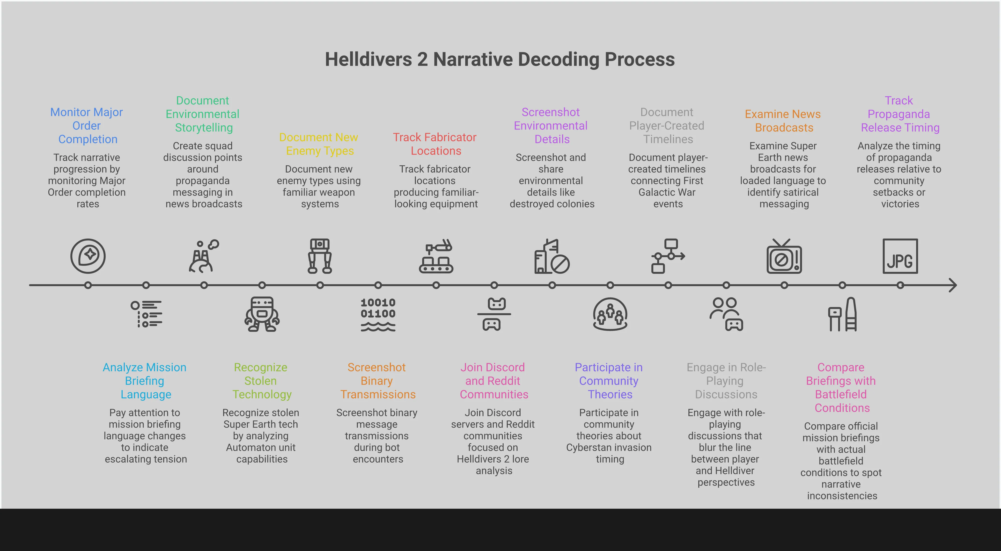 Как фанат Helldivers 2, я размышлял о том, как следить за сюжетом – я не хотел ничего упустить! Но оказалось, что традиционных кат-сцен нет. Сюжет на самом деле является войной! Он раскрывается через большие цели, которые Super Earth ставит перед нами, новости, которые мы получаем во время игры, и то, что происходит в наших сражениях. В основном, лучший способ быть в курсе – просто играть, читать детали миссий и наблюдать, как меняется галактическая карта войны в зависимости от того, что мы все игроки делаем вместе.