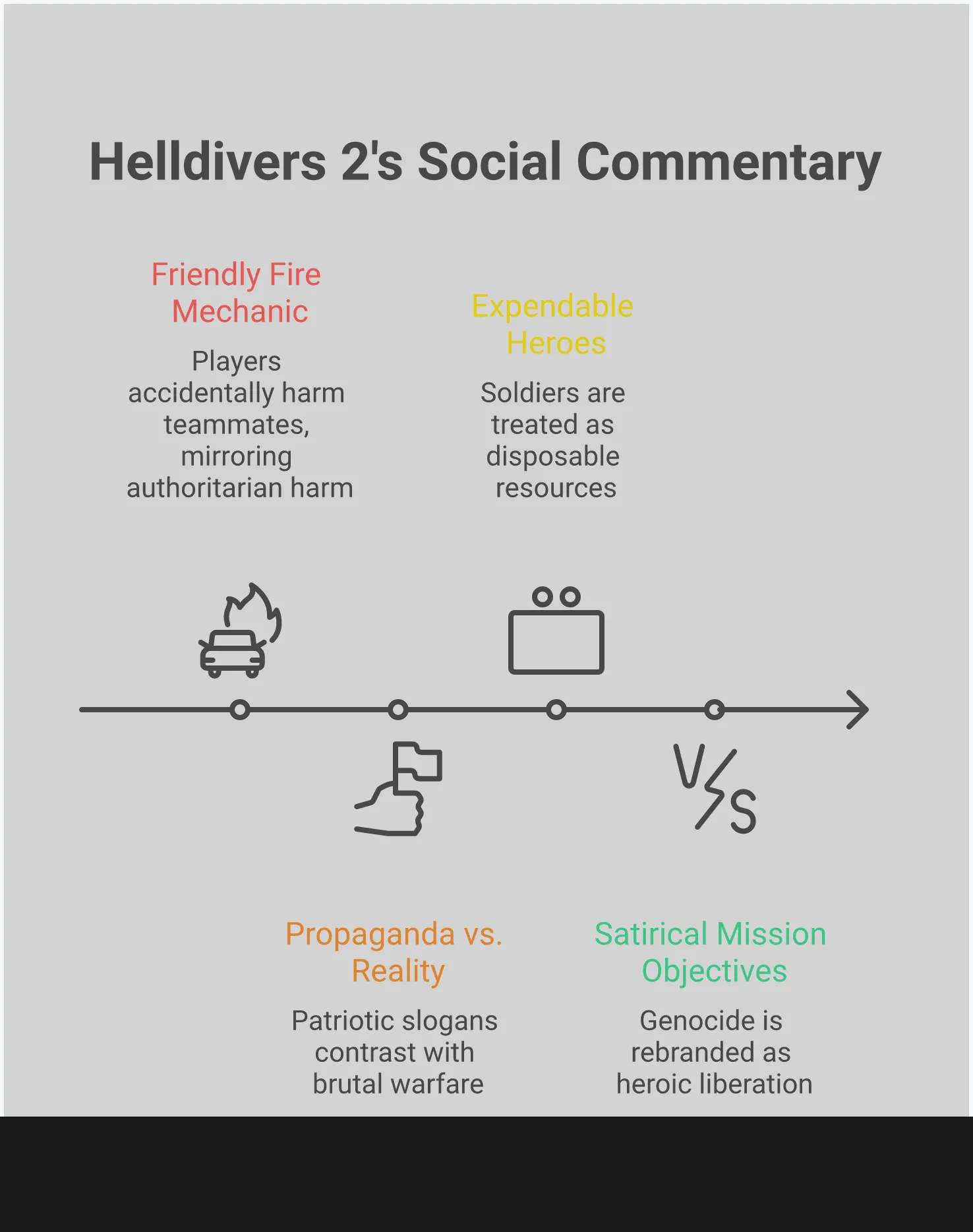 Чтобы по-настоящему понять Супер-Землю, посмотрите, как она ведет войну. Несмотря на то, что она изображает своих солдат как героев, защищающих мирное общество, ее военные стратегии на самом деле довольно жестоки. Официальный план полагается на подавляющую силу и легко принимает широкомасштабные разрушения. Такой подход, направленный на победу любой ценой, поднимает тревожный вопрос: не создают ли методы, используемые для поддержания их версии демократии, столько же вреда, сколько и предотвращают? Анализируя их тактику, мы можем увидеть за пределами героического образа и получить более честное понимание правительства, за которое мы якобы сражаемся.
